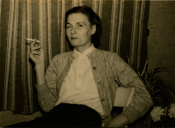 My mother in the early 1950s, holding her trademark Haus Bergman cigarette.