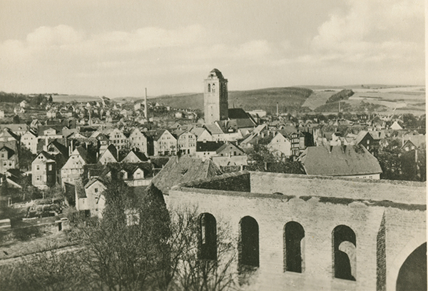 Bad Hersfeld as it looked in 1948, the year my family left the refugee camp and settled here. The tower of the old Gothic Stadkirch rises over the town. |