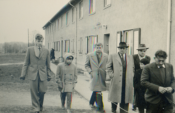 The quarters in Bremen for departing refugees. My father is the man in the dark Fedora hat. To his right is his brother, my Uncle Rudy. The young man directly behind is my cousin Michel, and the small boy is my younger brother Rüdiger. |