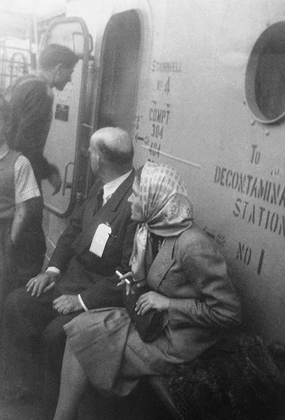 Onboard the ship, my father displays his stiff identifying tag and my mother relaxes with one of her Haus Bergman cigarettes. A few days later, my father would ask my mother, “What have we come to, Gila?” |