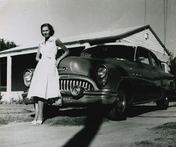 My mother poses with our first car, a Buick Roadmaster, in front of the house we called the “Shed.” |