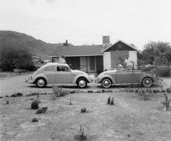 Gunther and I pose with our VWs in front of the Sunnyslope house in the mid 1960s.