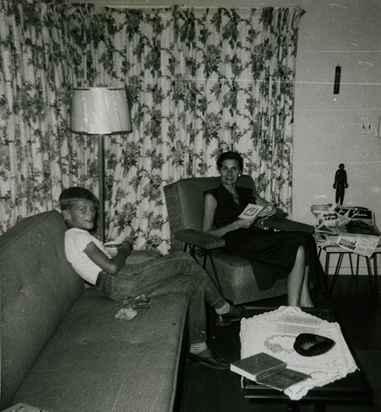 My brother Rüdiger and my mother in the living room of the house we rented from our sponsor. The furniture had been provided to us as well. |