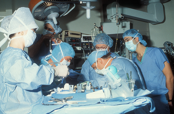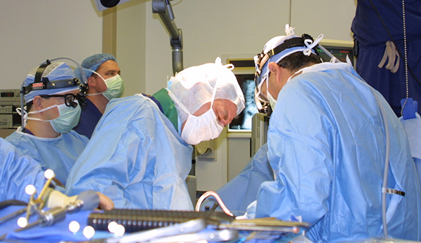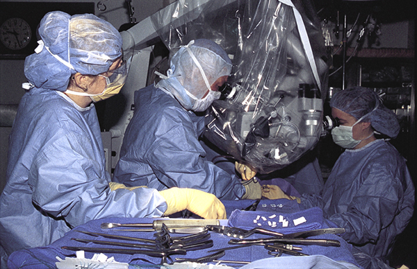 The surgical team that worked on TJ: Robert Spetzler (at right) drained off the blood clot pressing against the boy’s brain stem, while I reconnected his occiput to his spine using a new fusion technique. Behind and between us is pediatric neurosurgeon Hal Rekate.