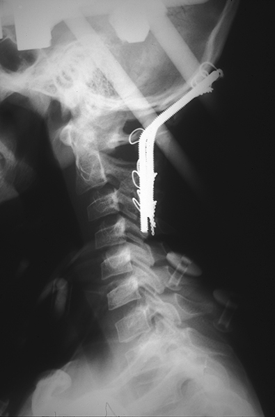 A post-op x-ray showing the instrumentation I devised to reattach the skull to the spine.