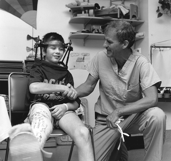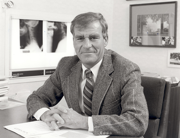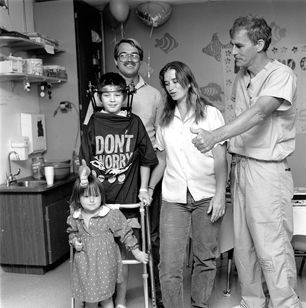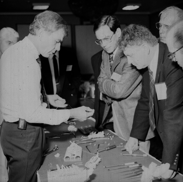 Demonstrating early instrumentation techniques in the emerging field of spinal neurosurgery in the mid 1980s. By the end of the decade, a turf war would break out over who should perform such surgeries, neurosurgeons or orthopedic surgeons.
